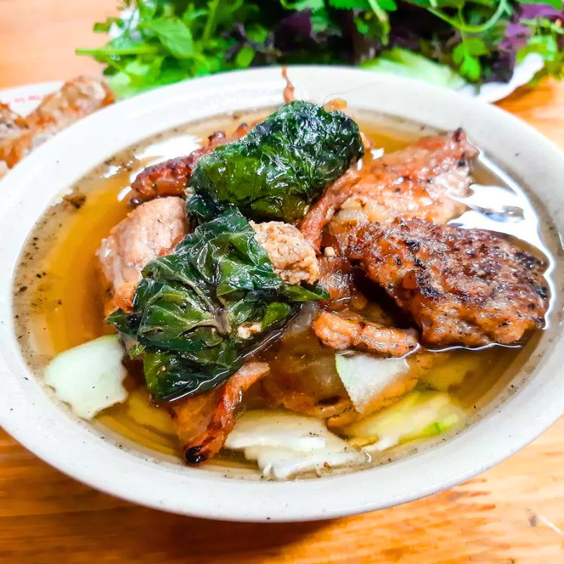 Der Bún Chả hier ist berühmt für seine rustikalen und authentischen Aromen: rauchiges Schweinefleisch, gegrillte Fleischbällchen, duftende Kräuter und frische Salatblätter. Die Sauce, perfekt ausgewogen, bringt eine zarte Süße mit, die das gegrillte Fleisch wunderbar ergänzt.