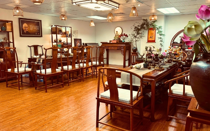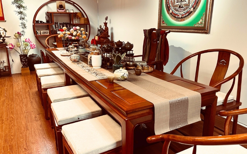 - La cérémonie du thé se déroule dans un cadre apaisant, décoré de lotus, symbole de pureté vietnamienne