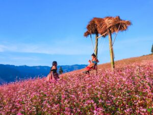 Umgeben von mächtigen Bergen ist Mèo Vạc einer der beliebtesten Orte, um die Buchweizenblüte zu bewundern. Während der Saison verwandeln sich die grünen Hügel in ein Meer aus rosafarbenen und violetten Blüten – ein unvergesslicher Anblick.