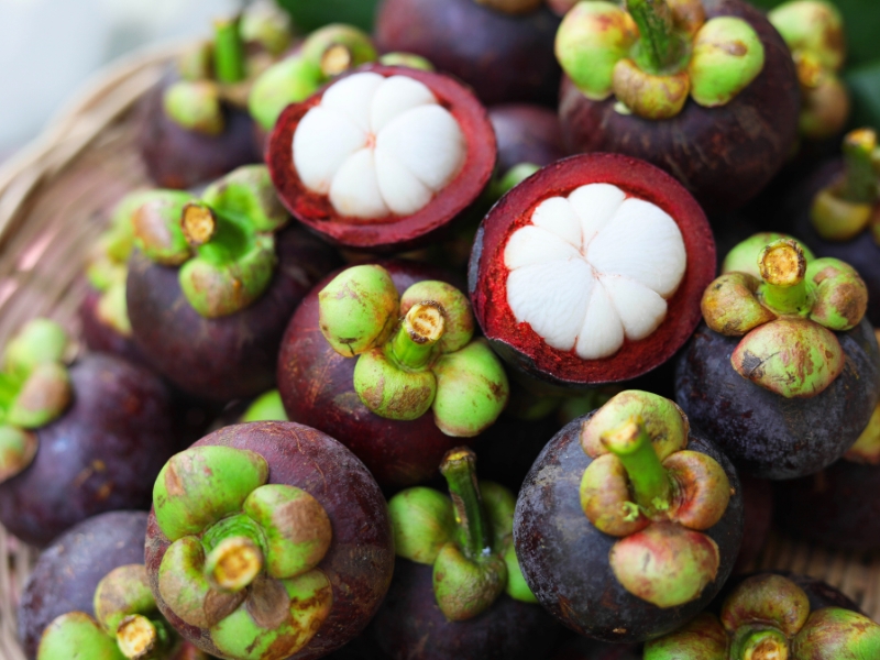 Der Mangostan, mang cut, wird auch „Königin der Früchte“ genannt. Seine dicke violette Schale verbirgt saftige weiße Fruchtsegmente mit einem feinen süß-säuerlichen Aroma.