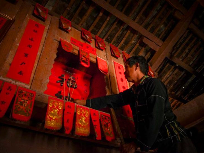 Am letzten Tag des Mondjahres stehen die Nùng im Morgengrauen auf, um Türrahmen, Altäre und Werkzeuge mit roten Papierschnitten zu schmücken. Die Muster – Blumen, fliegende Vögel oder schwimmende Fische – symbolisieren Glück und Wohlstand und zeugen zugleich vom handwerklichen Geschick der Bewohner.