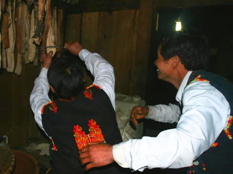 Für dieses Ritual bereitet jede Familie zwei Hühner vor: eines für die Ahnen, eines zur Rückholung der Seelen der Familienmitglieder. Der Schamane bindet Kleidungsstücke aller Angehörigen zusammen, legt sie über seine Schulter und ruft die Seelen am Dorfeingang zurück. Danach bindet er jedem ein schwarzes Armband um – ein Schutz gegen böse Geister.