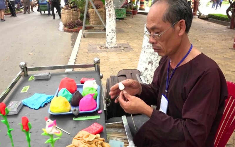Der Tò He ist eine kleine handgefertigte Figur aus Klebreismehl – nicht aus Plastik. Dieses traditionelle Spielzeug ist besonders im Norden Vietnams verbreitet, wird aber auch im Süden immer beliebter, insbesondere dank wandernder Kunsthandwerker. Die Figuren dienen nicht nur als Spielzeug, sondern auch als Opfergaben bei Zeremonien oder traditionellen Festen. Häufig stellen sie symbolische Tiere wie Hühner, Kühe, Schweine oder Fische dar – oder Blumen wie die Rose.