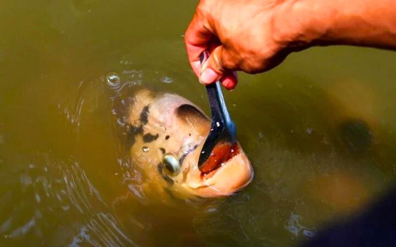 Wenn der Fütterungszeitpunkt gekommen ist, schlägt der Züchter auf einen Gong – ein Signal, das den Fischen ankündigt, dass es Zeit zum Essen ist. Das Futter wird in einen Behälter gefüllt und anschließend in ihren Käfig geworfen. Instinktiv springen die Fische aus dem Wasser, um die Nahrung zu ergreifen, was eine spektakuläre Szene bietet, die alle Besucher in Staunen versetzt.