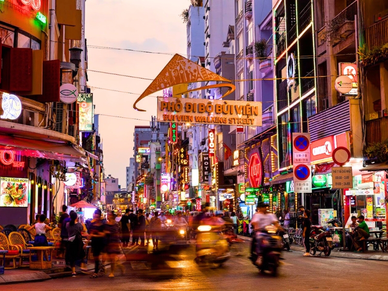 Im 1. Bezirk gelegen, ist die Straße Bui Vien das Herzstück des Nachtlebens von Ho-Chi-Minh-Stadt. Bei Reisenden aus aller Welt beliebt, verwandelt sich diese „Backpacker Street“ jeden Abend in ein Meer aus Neonlichtern, Straßenmusik und internationalem Publikum.