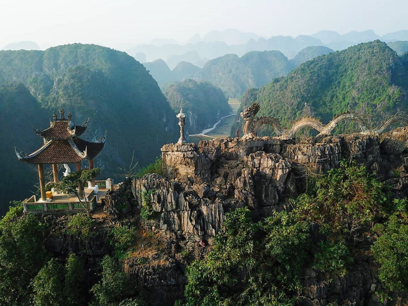 Après avoir gravi environ 500 marches en pierre, vous atteignez un belvédère surplombé d’une statue de dragon, d’où la vue sur la vallée de Tam Coc et la rivière Ngo Dong est à couper le souffle.