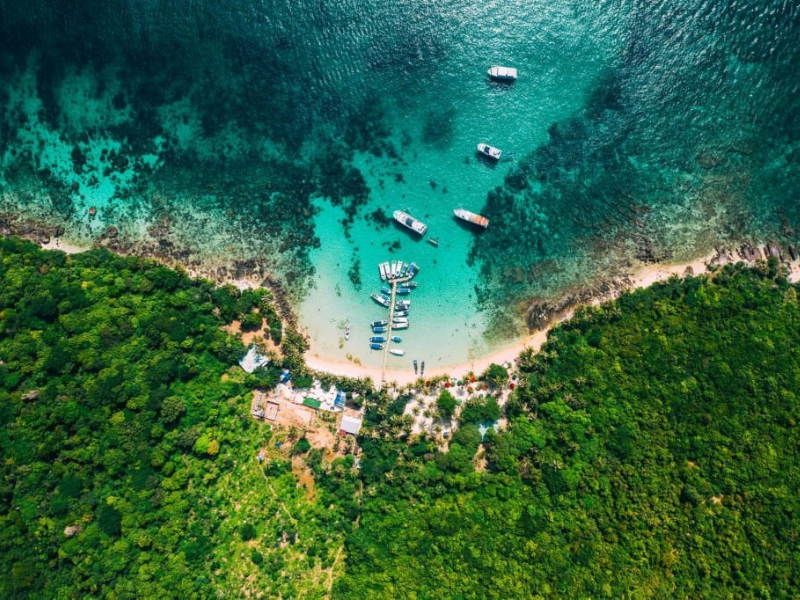 Im Norden der Insel liegt Rach Vem – ein friedlicher Strand inmitten eines traditionellen Fischerorts. Stelzenhäuser spiegeln sich im türkisfarbenen Wasser, bunte Boote prägen das Panorama.