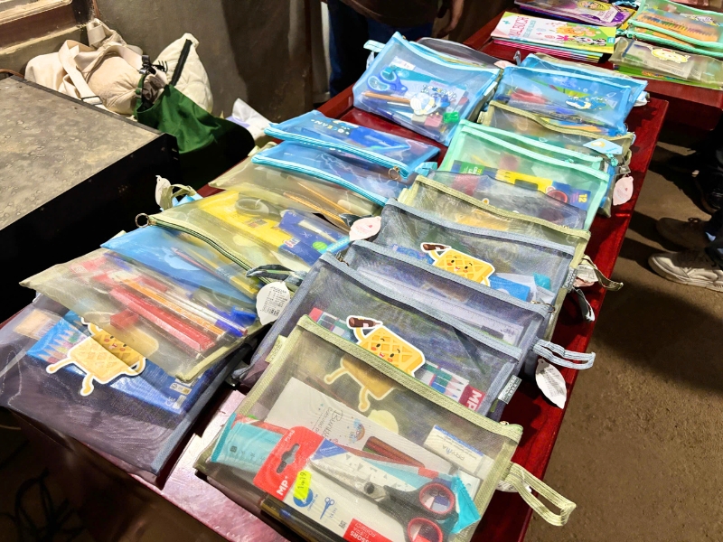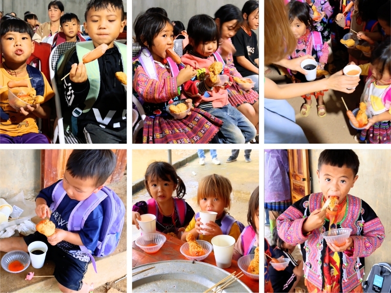 Um eine festliche Note hinzuzufügen, erhielt jedes Kind einen Snack bestehend aus einem Stück frittiertem Hühnchen, einer Wurst und einem kohlensäurehaltigen Getränk. Für viele Kinder war es das erste Mal, dass sie diese Geschmäcker probierten. Überraschung und Freude waren in ihren Gesichtern zu sehen, und manche konnten kaum glauben, dass dieses Festmahl für sie bestimmt war. Dieser gesellige Moment erhellte alle Gesichter und brachte große Freude ins Dorf, wodurch dieser Tag für jeden zu einer echten glücklichen Erinnerung wurde.