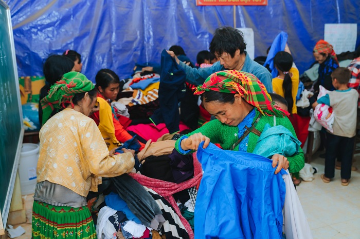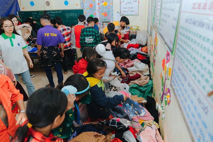 Außerdem verlief der ‚0-VND-Markt‘ an der Schule von Me Lau B sehr lebhaft. Alle erhielten Geschenke (Eimer, Töpfe, Körbe usw.) sowie Alltagsgegenstände, Lebensmittel und Kleidung. Wir sahen die Freude in den Gesichtern der Bewohner und Kinder. Ihre lächelnden Gesichter erwärmten unser Herz.
